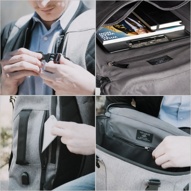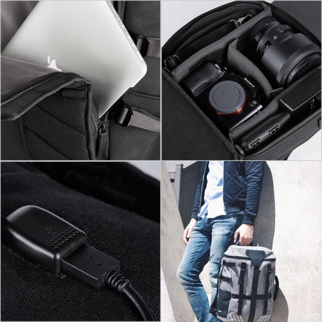 15インチまでのラップトップを収納可能なPCポケット、USB電源ケーブル、スキミング防止フィルムを内蔵した背面セキュリティーポケットなど、